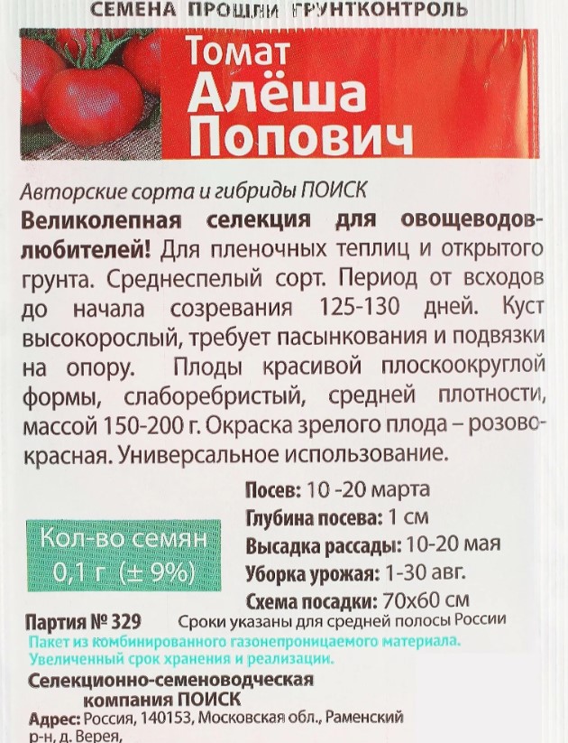 Среднозрял сорт за пластмасови оранжерии и открита земя. Периодът от поникването до началото на зреенето е 125-130 дни. Храстът е силно растящ, достига височина до 150 см и изисква прищипване и закрепване към опора или пергола. Плодовете са атрактивно сплескани, леко оребрени и средно плътни, с тегло 150-200 г. Зрелите плодове са розови на цвят. Имат отличен вкус. Препоръчва се за прясна консумация, доматени продукти и консервиране.— Альоша Попович – 3,29 кг, средно тегло 205 г – също добър, също червен