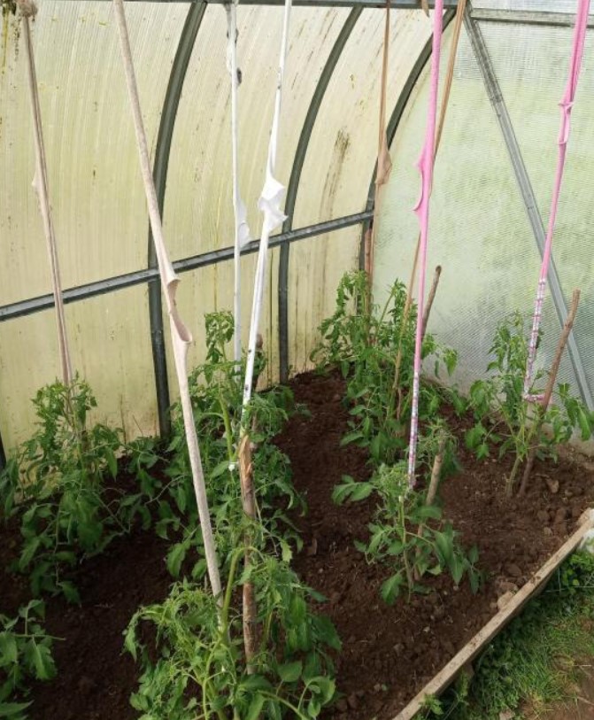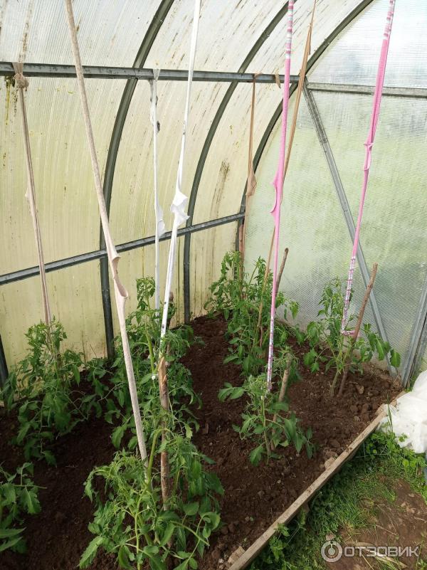 А на снимката вече е 11 май – точно така внесох порасналите и укрепнали разсад в оранжерията.След засаждането, завързах храстите.