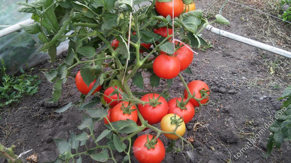 Добър домат, радвам се, че го отгледах този сезон. Едно растение е отгледано в пластмасова оранжерия, а три - на открито. И в двата случая беше много продуктивен и без болести. В оранжерията достигна 80 см, а на открито - 60 см. Страхотното лято допринесе за отличния му вкус. Вече купих семена за следващия сезон. На снимката на растението вече липсва един плоден грозд.