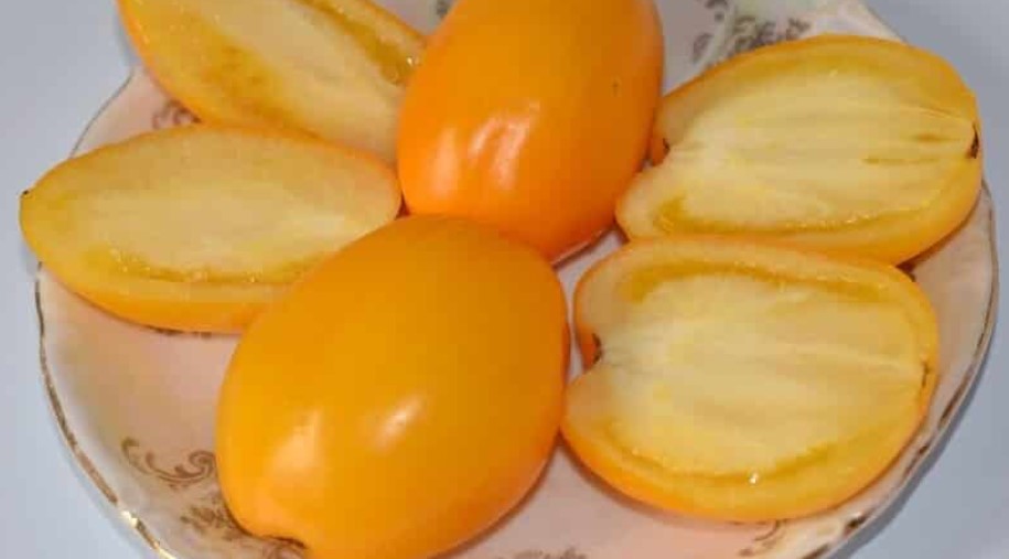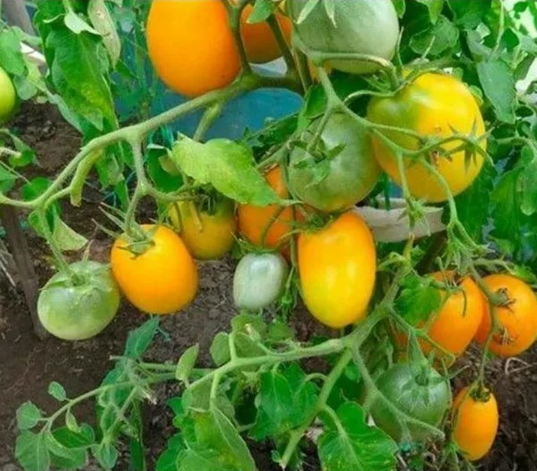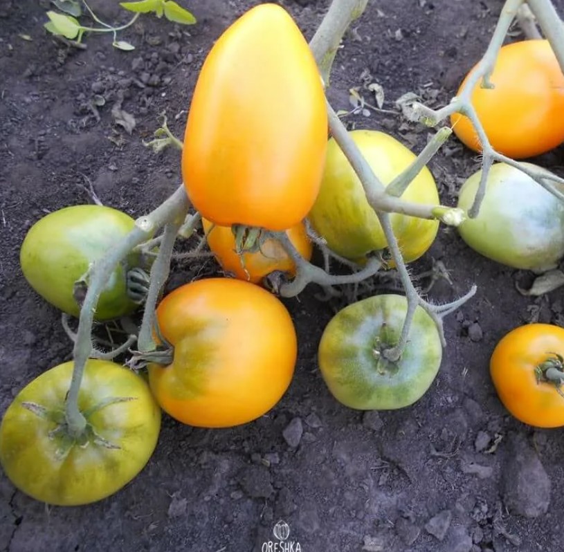 Расте добре на открито. В по-хладни райони може да се засажда в неотопляеми оранжерии. Този индетерминантен, къснозреещ сорт расте до 200 см. Изисква подпори и формоване. Подходящ е за салати и всички видове консервиране. | Плодовете са малки, яйцевидни, с гладка, лъскава кора. Месото и кората са оранжеви, с тегло 120 г. Вкусът е отличен. |