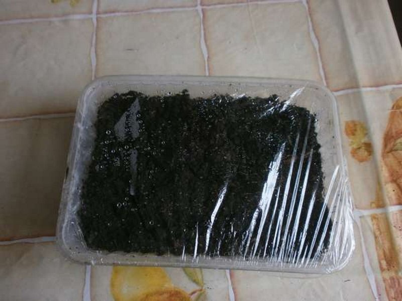 След това покрийте съда с пластмасово фолио или стъкло и го поставете на топло място, докато се появят разсадите. Периодично проветрявайте разсада, за да предотвратите натрупването на конденз вътре.