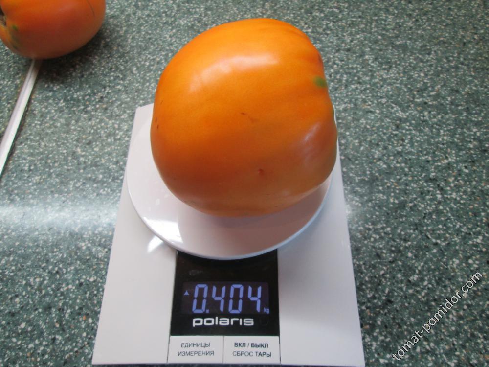 Сортът има едри, кръгли плодове. Доматите тежат средно 300 грама. Някои бяха 400-450 грама. Никога не съм постигал обявеното от производителя тегло до 600 грама. Плодовете са оранжеви.