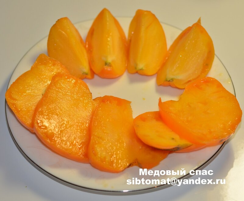 Добивът е под средния в сравнение с други (не само моят, но и на собственика на семената, който го сади от няколко години). Като домат от северен тип, има тънки листа и не обича топлина. Подобно на Вкусняшка, също е капризен в студеното време. Аз имах само 2-3 на грозд и отгледах средно големи. Но вкусът е наистина меден!!! :niam: Отглеждайте го като деликатес, а не за количество. Оказа се дори по-сладък от Сердца Ашхабад, но започна да узрява по-късно.