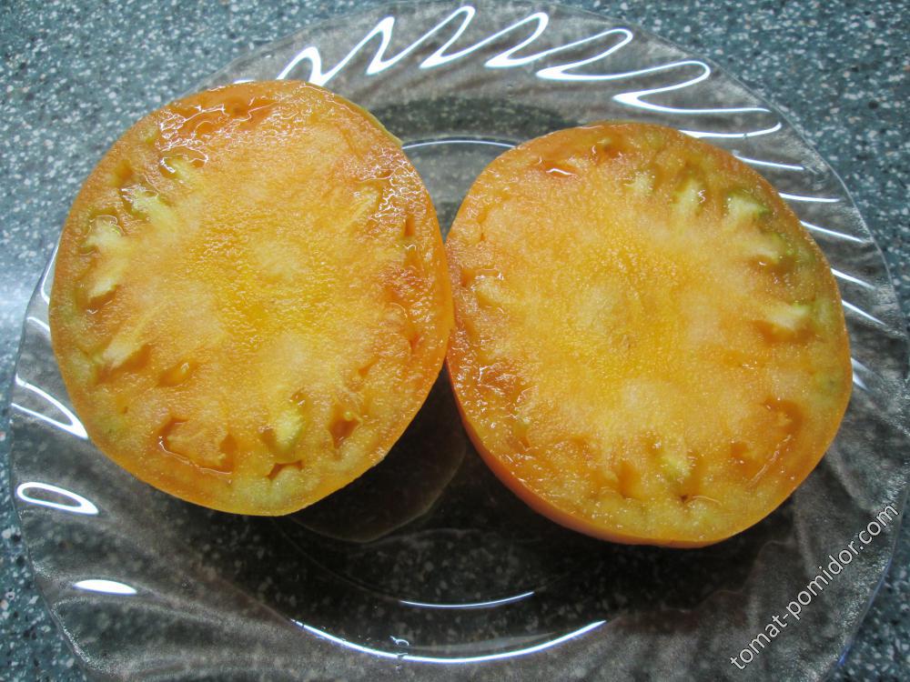 Среднозреещ индетерминантен сорт за открита земя и оранжерии. Изисква подравняване и оформяне. Подходящ за салати. Продаваемостта е 98%, а добивът на зрели продаваеми плодове е 74% (Новосибирска област). Устойчив на неблагоприятни условия на отглеждане, устойчив на топлина и лесен за транспортиране. | Кръгли, гладки, оранжеви, 160-218 г. Отличен вкус. Плодовете се съхраняват добре. |