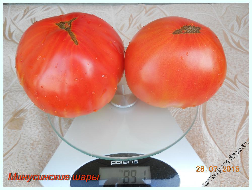 Плодовете от сорта Минусински топчета са наречени с причина - те наистина приличат на топчета. Градинарите отбелязват неравномерността на реколтата: някои домати тежат не повече от 200 г, докато други достигат до 500 г.