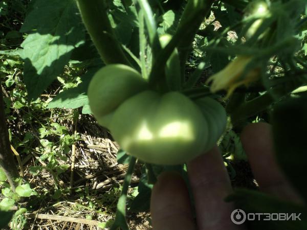 Доматите са сплескани и силно оребрени. Когато не са узрели, близо до стъблото може да се види яркозелено петно. С узряването на доматите това петно избледнява и плодът става розов.