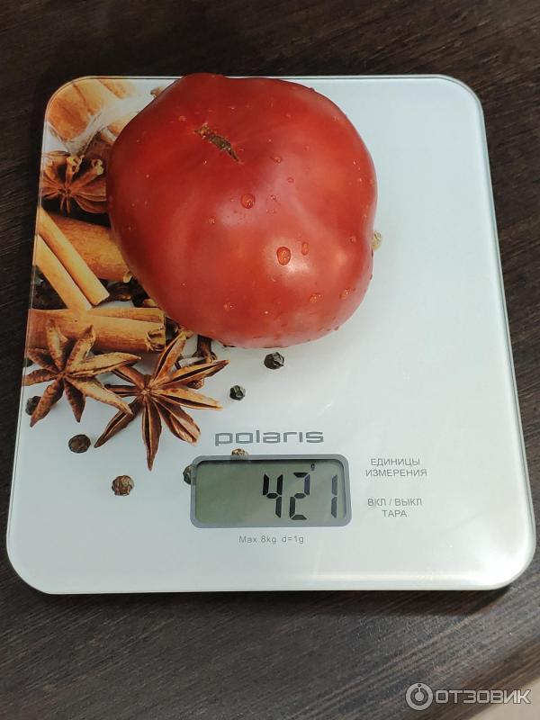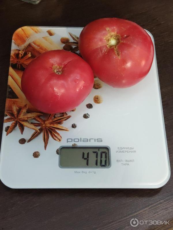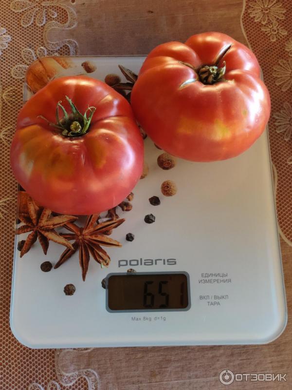 Доматите са сравнително едри, като производителят оценява теглото им на 350 г, но много градинари са открили много по-тежки домати. Това е особено вярно, ако доматите са оформени в едно стъбло и времето е горещо и слънчево.