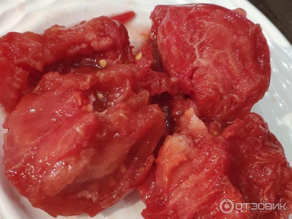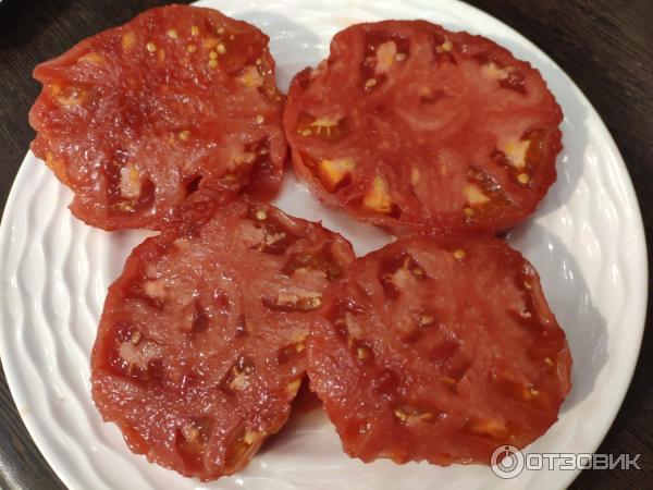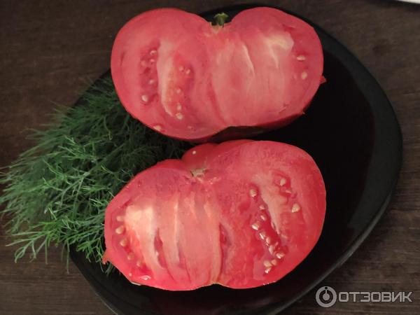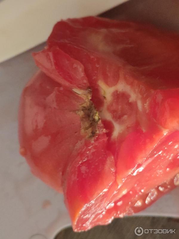 Винаги подчертавам, че не ми харесва, когато доматите имат бели жилки и удебелявания близо до стъблото (както например при красивия черноплоден сорт с „показателното“ име „Черномор“).Изненадващо, дори с такова огромно тегло (над 500 грама), тези домати нямат бучки! Вижте снимката по-долу; обелих кожата около стъблото и месестата част е розова, на практика без бяло.