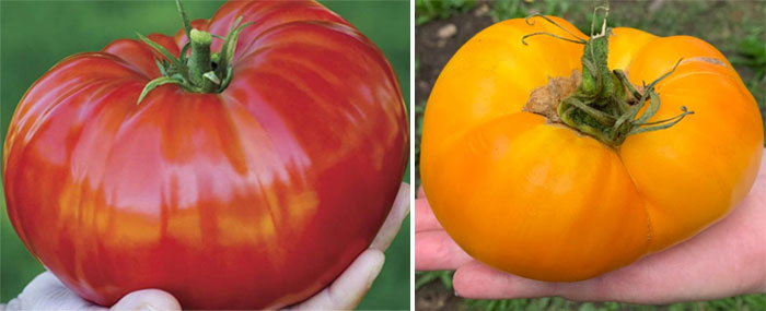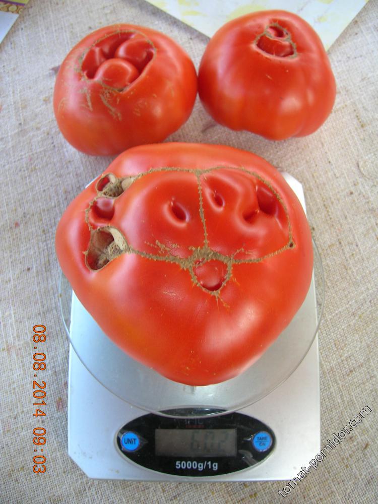 Средно късен индетерминантен сорт за открита земя и оранжерии. Подходящ за салати, предястия и преработка в доматени продукти. | Плоско-кръгли, леко оребрени близо до дръжката, червени, рядко жълти и розови, 400 г (до 800 г). Добър до отличен вкус. |