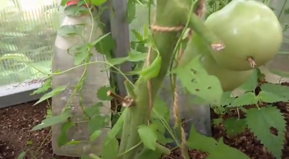 Тези домати изискват много влага и хранителни вещества по време на зреенето. Подхранихме ги с инфузия на лопен и добавки с калий и фосфор — имаме недостиг и на двете.