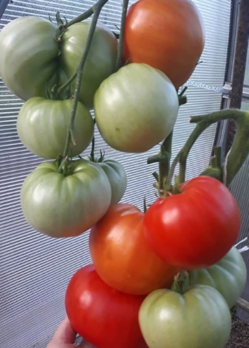Среднозреещ индетерминантен сорт за открита земя и оранжерии. Изисква подпъхване и формиране на 1-2 стъбла. Подходящ за салати и преработка в доматени продукти. | Плоско-кръгли, оребрени, тъмно розови с тъмнолилави ивици, 150-250 г. Отличен вкус. |
