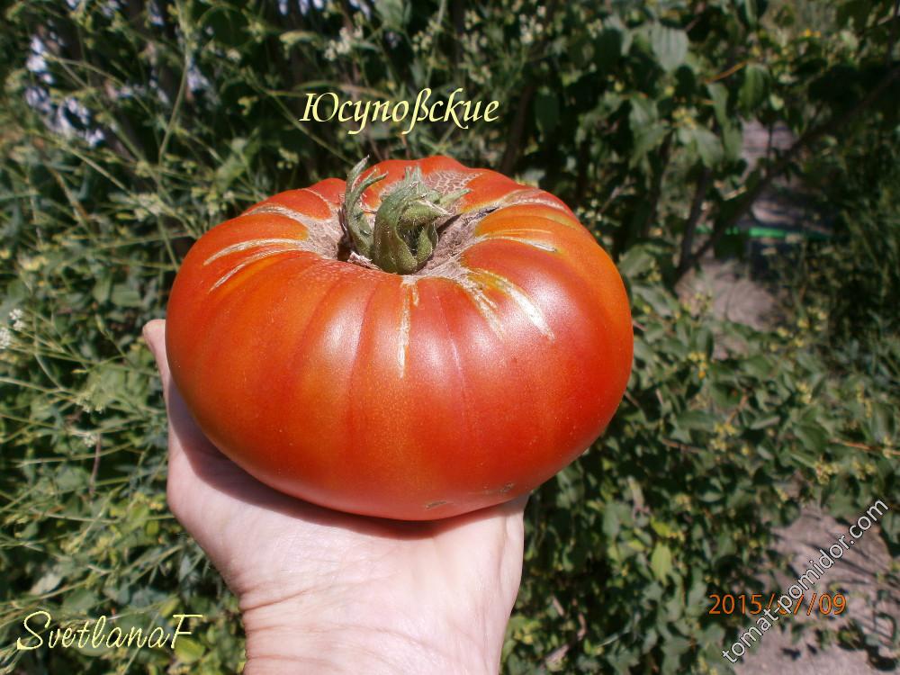 Стар сорт, легендарен. В Узбекистан е имало председател на колхоз на име Юсупов, за когото се твърди, че е бил приятел с Хрушчов. В полетата на този колхоз са се отглеждали вкусни местни домати. Този сорт се нарича Юсуповски на името на този председател (да не се бърка с благородническата фамилия Юсупови, които, макар и роднини на царското семейство, нямат връзка с тези домати). Обърках се със сорта. Трябваше да взема предвид, че е южен сорт и следователно е малко вероятно да има кратък вегетационен период. Трябваше да го засадя много по-рано, разбирайки, че се нуждае от период на затопляне при нашето време. Но дори и с всичките ми грешки (дори изгорих върха му, когато не уцели покрива на оранжерията), сортът се представи много добре.
