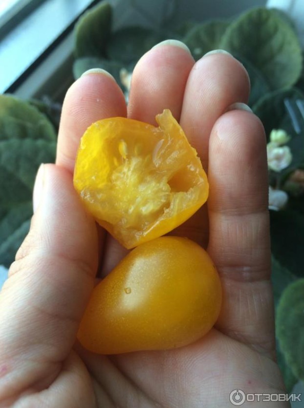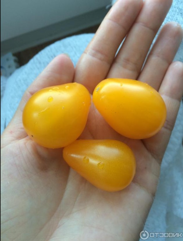 Плодовете са малки, с крушовидна форма и жълто-оранжеви. Кожицата е доста тънка, а самите плодове са меки, особено след като престоят известно време. Вътрешността е нежна и сочна. Те са сладки и много вкусни, с отчетлив доматен вкус. Много харесвам този сорт. Препоръчвам го на любителите на чери домати.