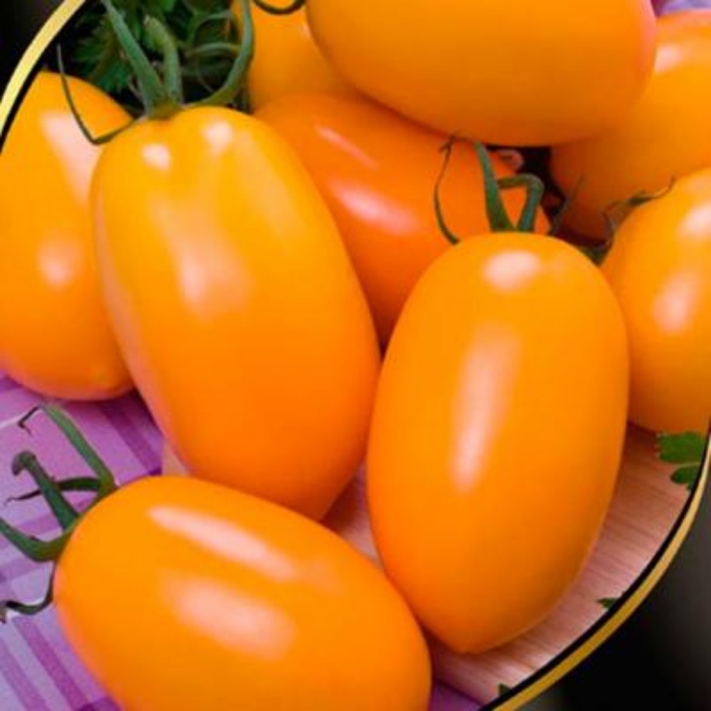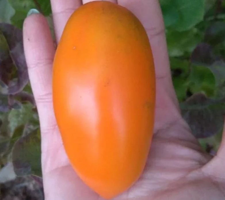 Расте добре на открито. В по-хладни райони може да се засажда в неотопляеми оранжерии. Този индетерминантен, къснозреещ сорт расте до 200 см. Изисква подпори и формоване. Подходящ е за салати и всички видове консервиране. | Плодовете са малки, яйцевидни, с гладка, лъскава кора. Месото и кората са оранжеви, с тегло 120 г. Вкусът е отличен. |