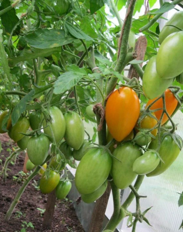 Храстите израснаха на височина около 70 сантиметра, с гъсто разположени гроздове от по пет плода. Храстът беше буквално покрит с домати, които са устойчиви на болести.Плодовете са с кремообразна форма със заострен връх; когато са зелени, има тъмно петно близо до дръжката.