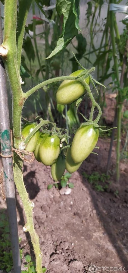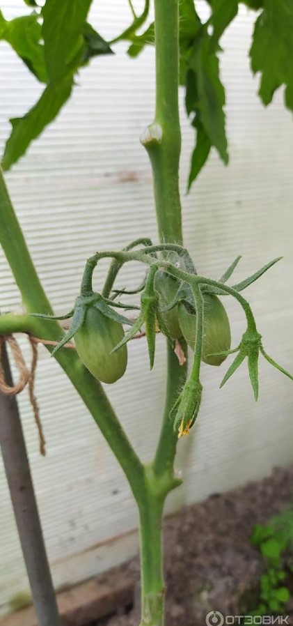 Ето снимка от 13.06, където се виждат плътни яйчници.И за сравнение, ето снимка на плодовете след 11 дни, т.е. 24 юни. На един храст се образуват няколко клона, всеки с приблизително 8-10 домата.