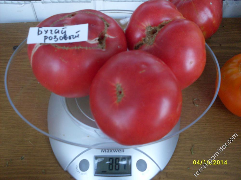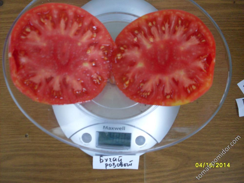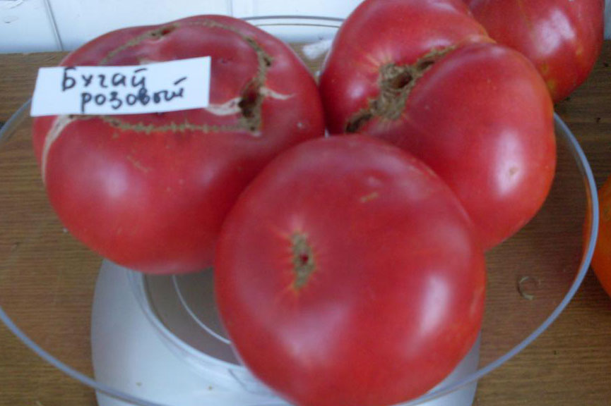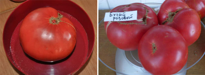 Червените и розовите домати Бугай имат кръгла, леко сплескана форма. Теглото им варира от 300 до 1000 г. За да се получат най-големите плодове, храстът трябва да се отглежда в оранжерия, образувайки единичен издънка.