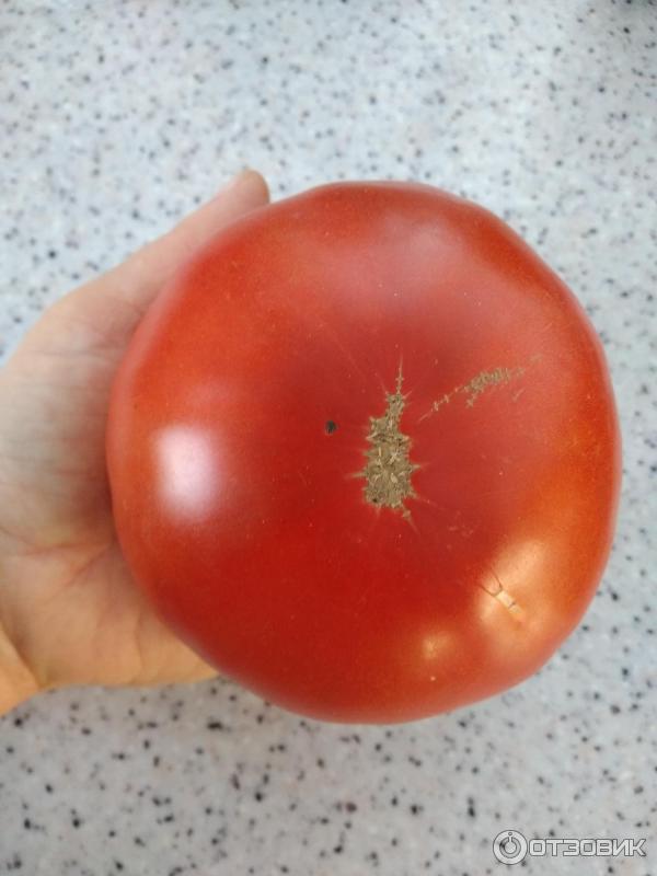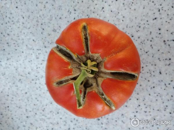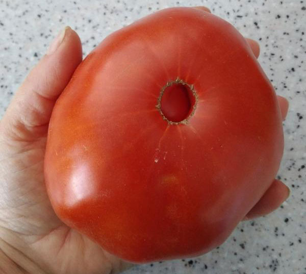 Но от другата страна изглежда така. Също е напукано. Очевидно е, че целият връх трябва да се отреже. Но аз не изхвърлям нищо. Имам няколко кокошки носачки, които много ценят доматите. Така че им давам всички остатъци.
