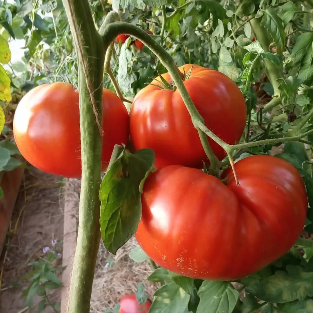 Средно късен, индетерминантен, стандартен сорт за открита земя и оранжерии. Подходящ за салати и преработка в доматени продукти. | Плоско-кръгли, големи, червени, 320 г. Вкусът е добър и отличен. |