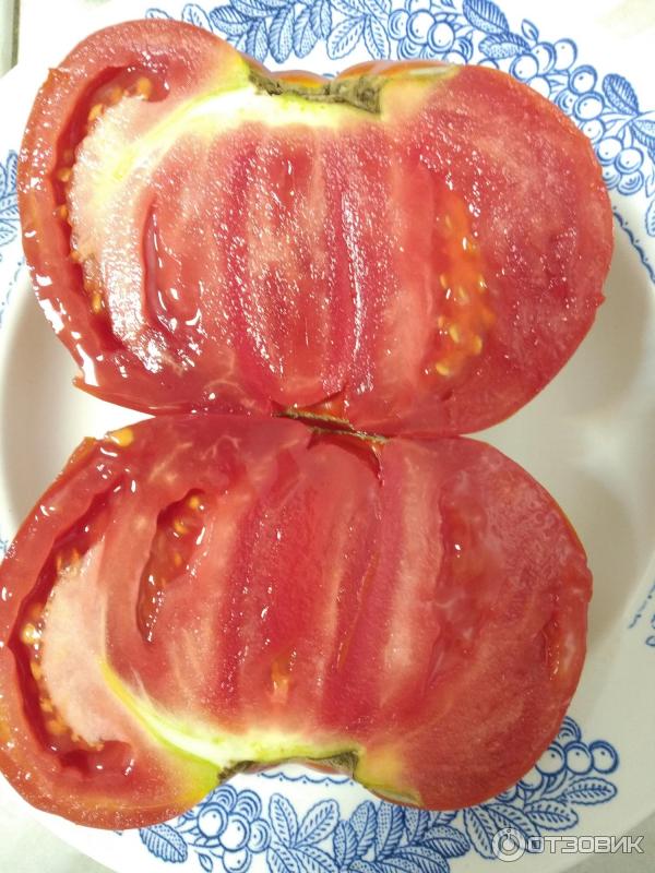 Да видим как ще изглежда, когато се разреже. Има малко зеленина близо до стъблото, която, разбира се, ще трябва да се отреже. Но като цяло е добър домат - месест, тъмночервен. Този сорт домати би бил чудесен за кетчуп, но днес ще го ям на работа.