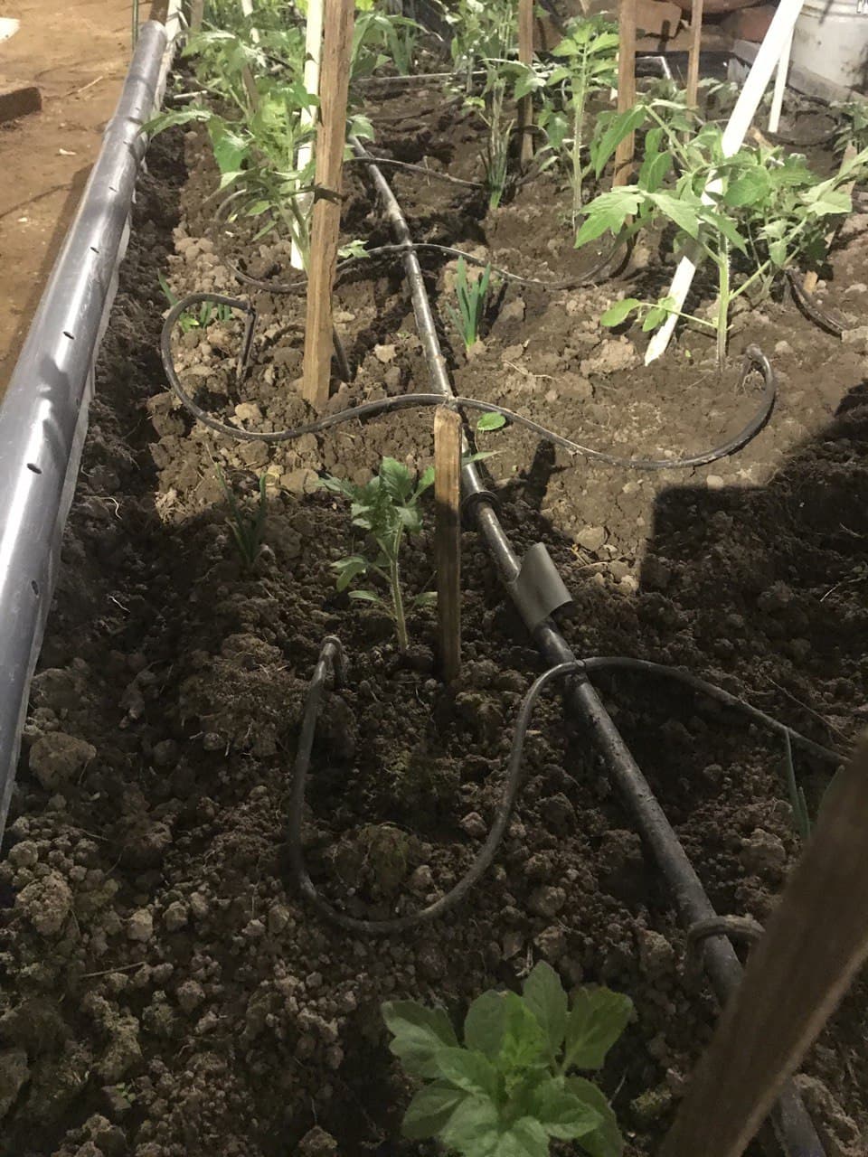 Доматите се прехвърлят във всяка дупка заедно с бучка пръст върху корените, след което дупките се запълват, поливат и мулчират.