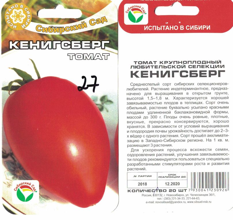 Градинар съм от 25 години и вече 10 години използвам поликарбонатна оранжерия, така че всичките ми отзиви за домати ще бъдат за домати, отглеждани в оранжерия. В минно-металургичната зона на Южен Урал смятам, че е по-практично да се използва оранжерия, а също и семена от компанията „Сибирска градина“. Имам няколко любими домата от „Сибирска градина“, въпреки че имат много богат избор, но започнах да отглеждам домата „Кьонигсберг“ преди 20 години в пластмасова оранжерия и сега винаги го отглеждам всяка година.Сортът е разработен от селекционера В. Дедерко в Новосибирска област, демонстрирайки изключителната си устойчивост на суров климат. Той също така показва висока устойчивост на основни болести. За разлика от повечето сибирски домати, Кьонигсберг не е хибрид, а чист сорт.
