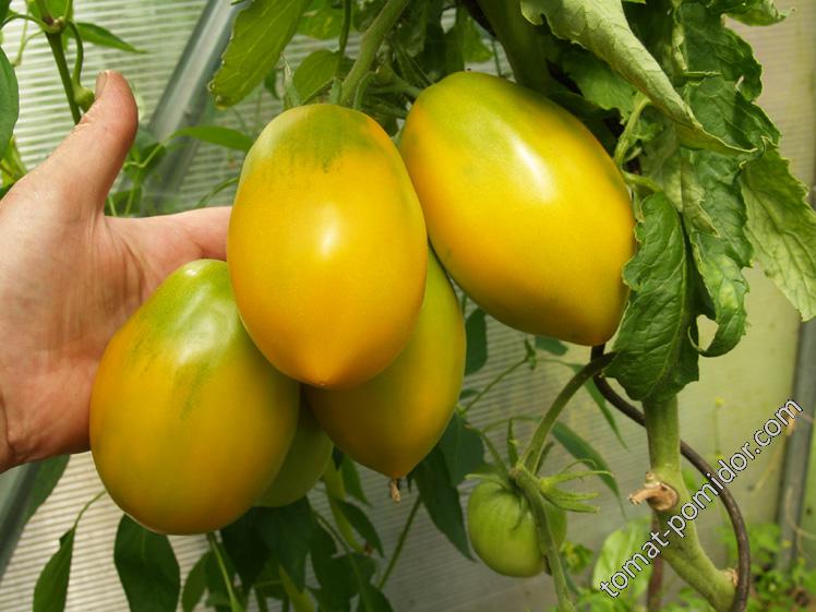 Неопределено растение с храст до 200 см височина. Препоръчва се за отглеждане под пластмасово покритие. Храстите са оформени в два издънки и изискват подкрепване. Този универсален домат е подходящ за консервиране на цели плодове и може да се използва в диетични менюта. | Плодовете са кръгло-овални с гладка повърхност и леко вдлъбване в основата. Зрелите плодове са ярко жълти или златисти на цвят, с тегло 80-90 г. Вкусът е отличен. |
