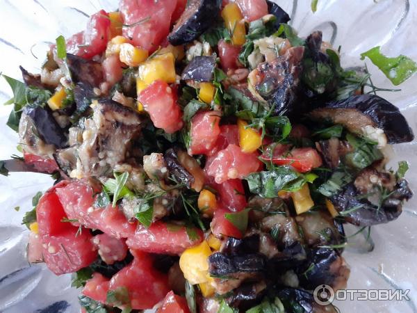 Освен нарязано, го ядем и в салати с леко пържени патладжани, цветен босилек, магданоз и копър: