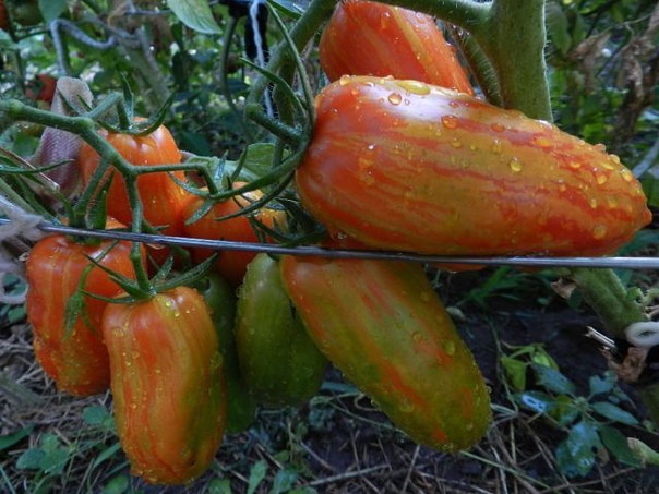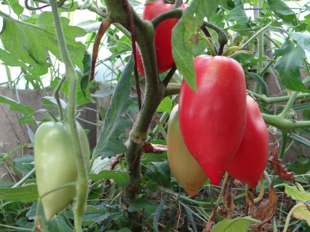 Хареса ми доматеното растение. Бях чел, че не е продуктивно, но въпреки това го засадих, защото харесвам дълги. Добивът беше доста добър, като първите бяха по-големи и по-дебели, а после по-дълги. Обрах растението в края на септември. Мислех, че ще е много крехко, но е поносимо, с леко увиснали листа, но иначе растението е доста здраво. (Вижте Orange Heart – понякога си мислех, че в началото ще умре, цялото извито и с увиснали листа.)