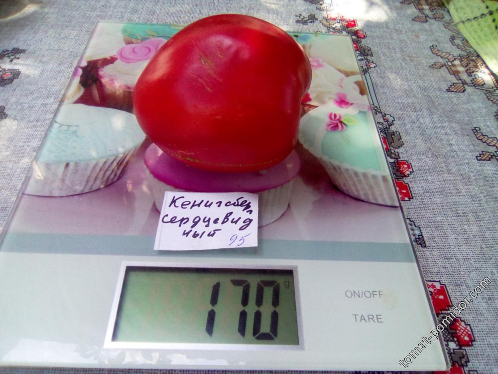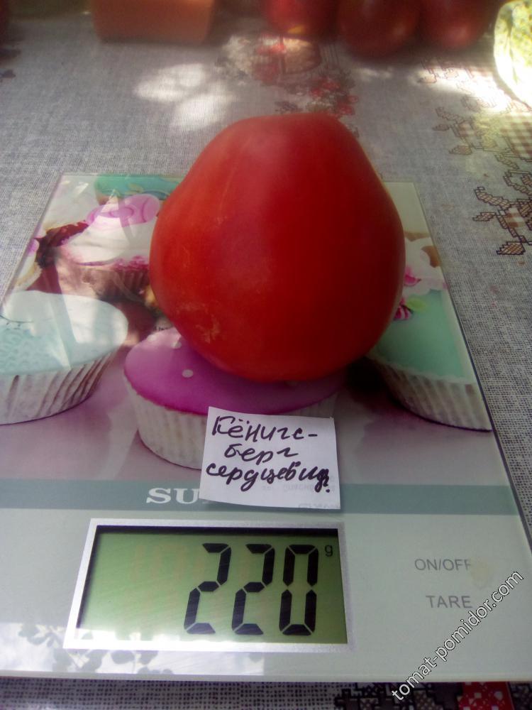За любителите на домати, бих искала да оставя моя отзив за сорта Кьонигсберг. Бях почерпена с домат и ми хареса. Реших да опитам да го засадя. И го направих. Разсадът беше много равномерен. Растенията са високи и обилно облистени. Харесаха ми гроздовете - не са твърде големи, прости, с 4-6 плода на грозд. Размерите на плодовете варират от 150 до 650 грама. Най-големият домат тази година беше 730 грама и това не беше само един домат на растението, а цял грозд.