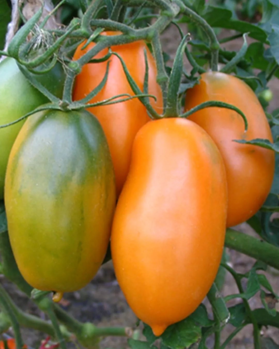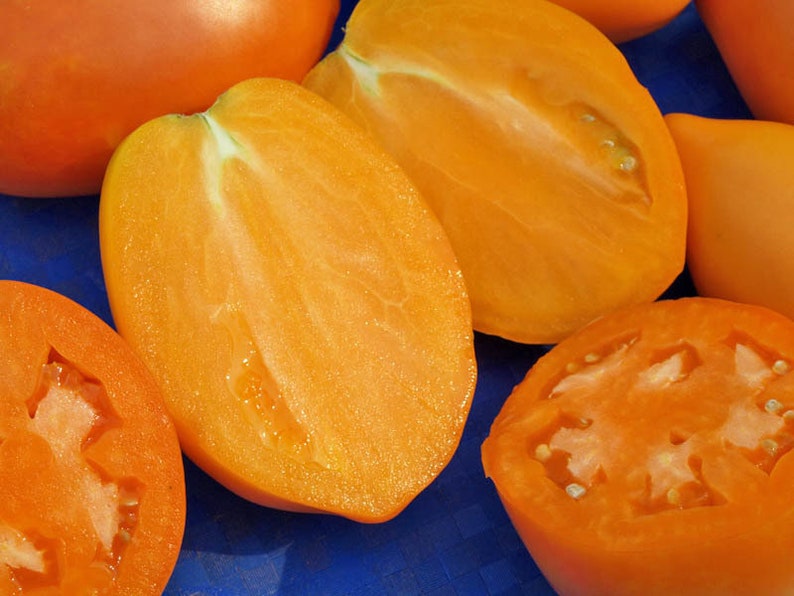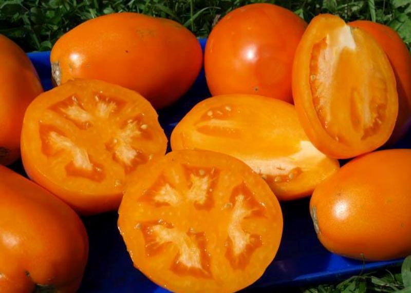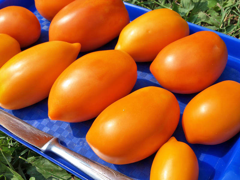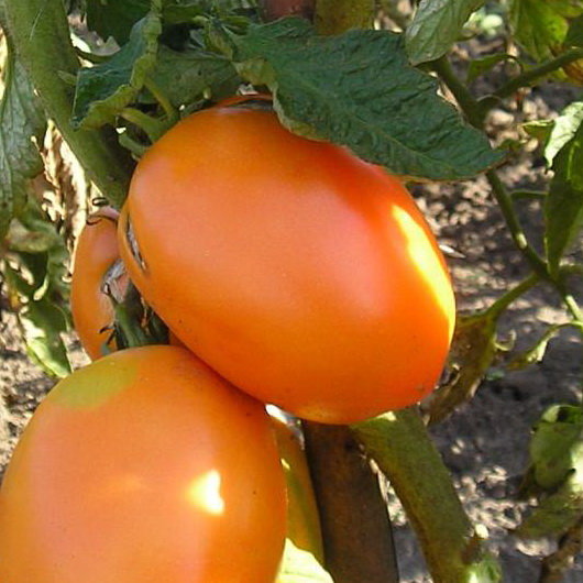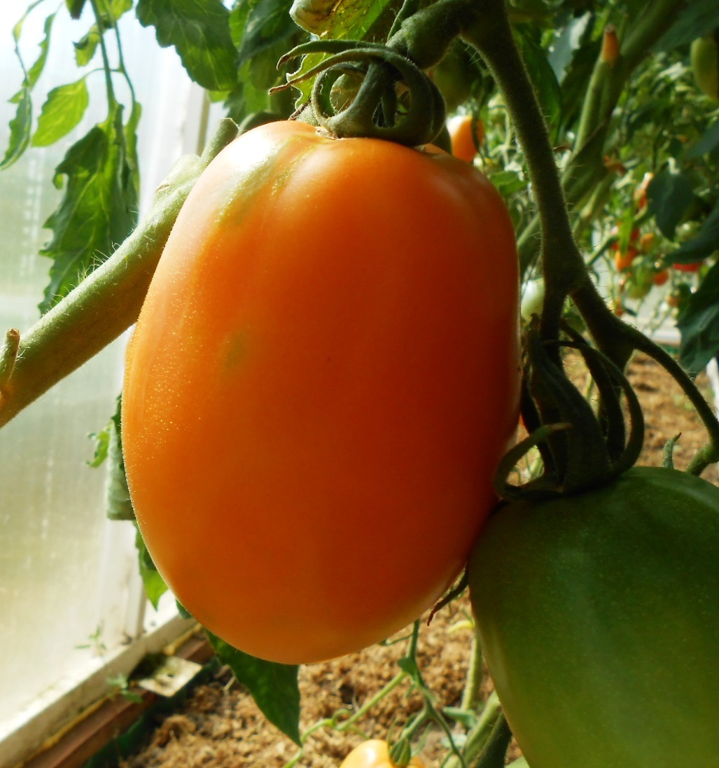 Расте добре на открито. В по-хладни райони може да се засажда в неотопляеми оранжерии. Този индетерминантен, къснозреещ сорт расте до 200 см. Изисква подпори и формоване. Подходящ е за салати и всички видове консервиране. | Плодовете са малки, яйцевидни, с гладка, лъскава кора. Месото и кората са оранжеви, с тегло 120 г. Вкусът е отличен. |