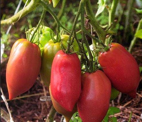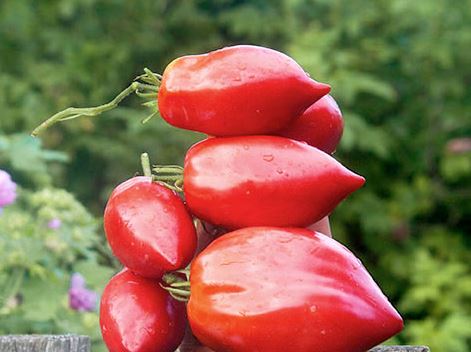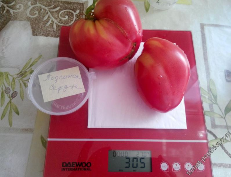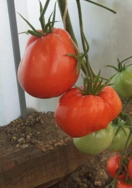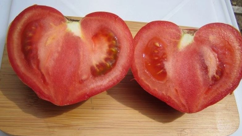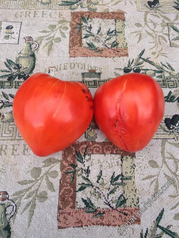 Ранозреещ индетерминантен сорт за оранжерии. Изисква подпъхване и оформяне на 1-2 стъбла. Подходящ за преработка в доматени продукти и консервиране. | Сърцевидни, леко оребрени, малинови, 350-500 г. Отличен вкус. |