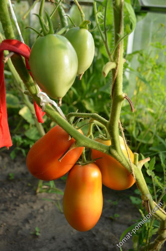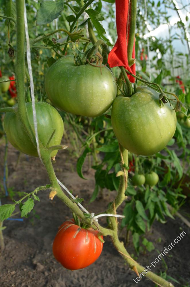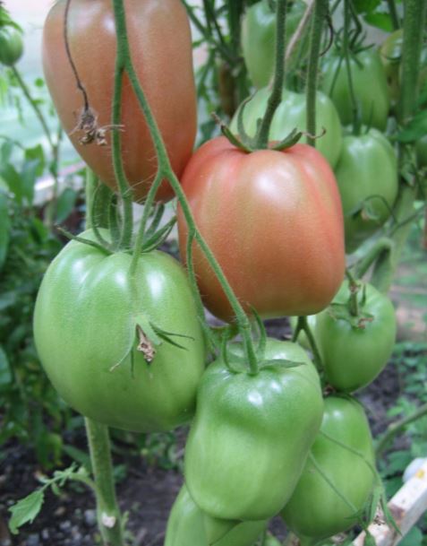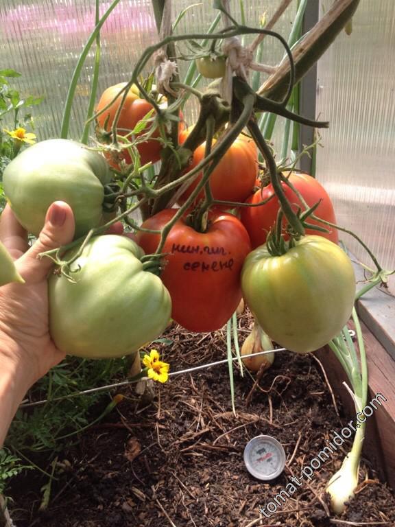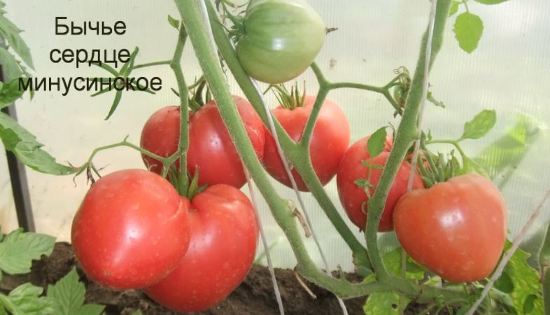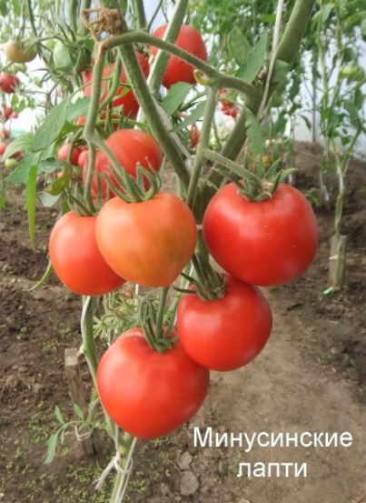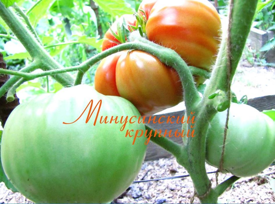 Сортовете бяха Червен едър, Волско сърце, Оранжеви и червени очила и Оранжева круша. Купих и Минусински гигантски розов, Минусински топчета и Минусински ябълкови топчета от колекционери. Всички ми харесаха. Някои бяха по-големи, други по-малки. Но забелязах, че са доста ранни. Работата е там, че в края на май имахме слана от -7 градуса по Целзий. Върховете на доматите в новата оранжерия замръзнаха, точно на ръба, където бяха Минусинските, с изключение на Груша (този сорт беше в друга оранжерия). Нагревателят беше точно по-близо до другия ръб. Трябваше да отрежа върховете. Появиха се странични издънки. Мислех, че това е, няма да има реколта. Оставих два странични издънки. Но накрая всички дадоха плодове, образуваха се няколко грозда и дори някои домати се зачервиха на храста, въпреки студеното и дъждовно лято.