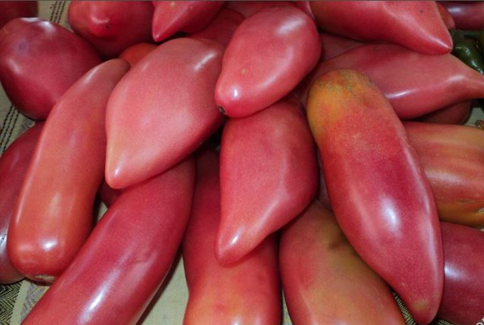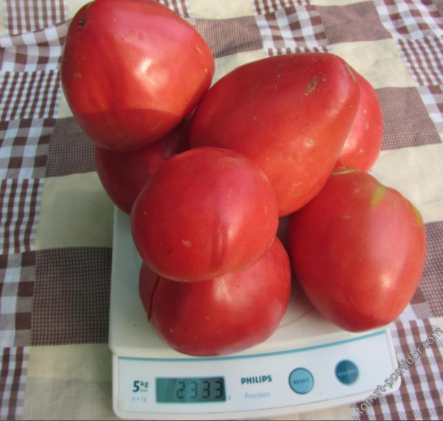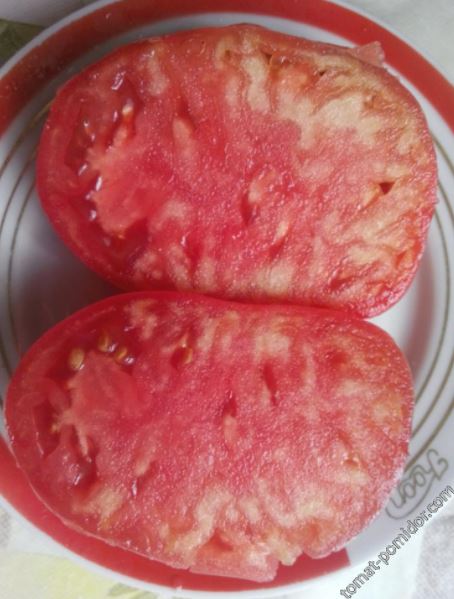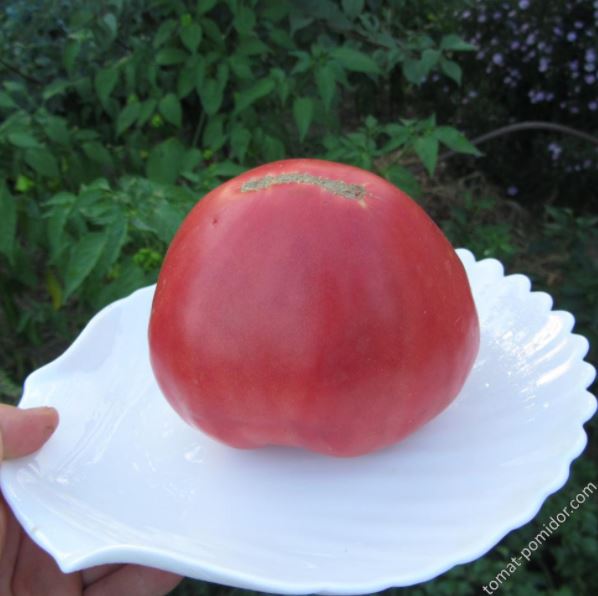 Среднозреещ индетерминантен сорт за открита земя и оранжерии. Подходящ за салати, консервиране и преработка в доматени продукти. | Сърцевидна, удължена, с чучур, оребрена, малиново-розова, 200-250 г (до 400 г). Вкусът е добър до отличен. |