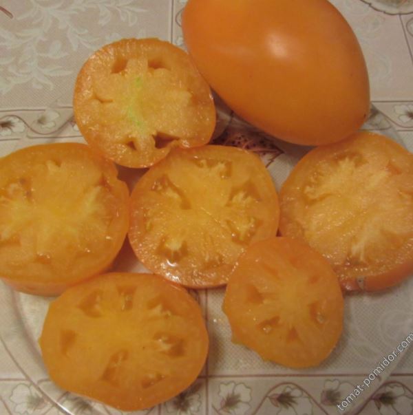 Ранен неопределен сорт. Отглеждането на открито е приемливо в по-топлите райони. В централна Русия се препоръчва засаждане в оранжерии. Подходящ за салати. | Кръгли, оребрени, оранжеви, до 300 г. Отличен вкус. |