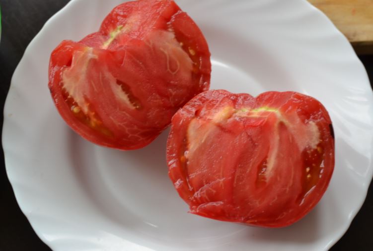 Средно ранен индетерминантен домат за открити градински лехи и пластмасови укрития. Подходящ за салати. | Кръгли, сплеснати, с ясно изразени оребрени ръбове, тъмно розови или бордо, 270 г. Отличен вкус. |