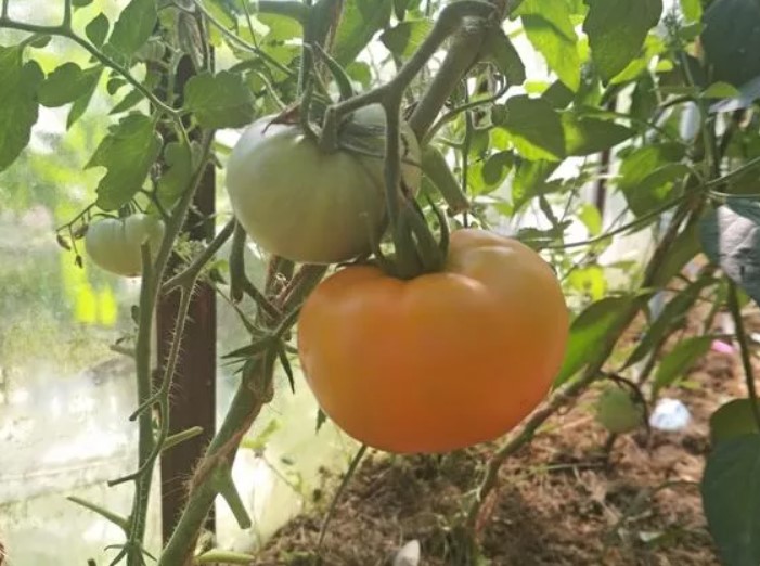Това доматено растение даде едни от най-големите плодове в моята оранжерия. Снимката показва домат, който тежи 772 грама. Жалко, че не снимах най-големия. Един домат като този е достатъчен, за да нахрани цяло семейство със салата.