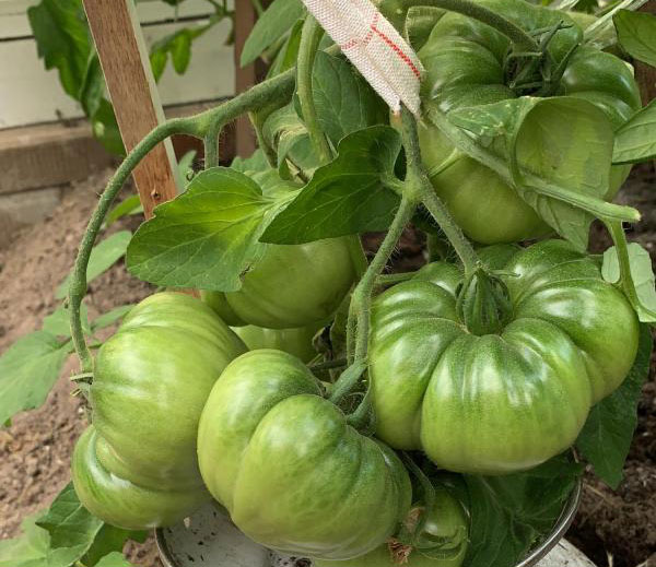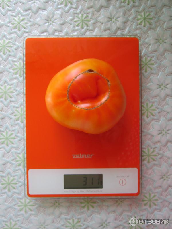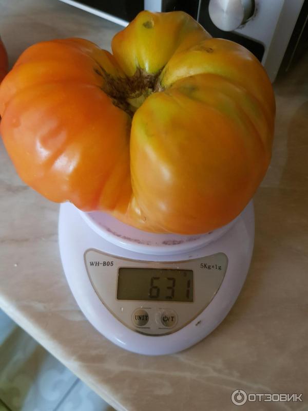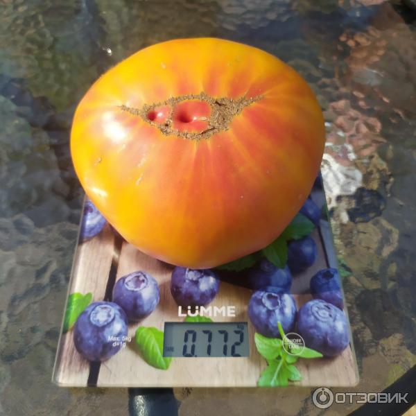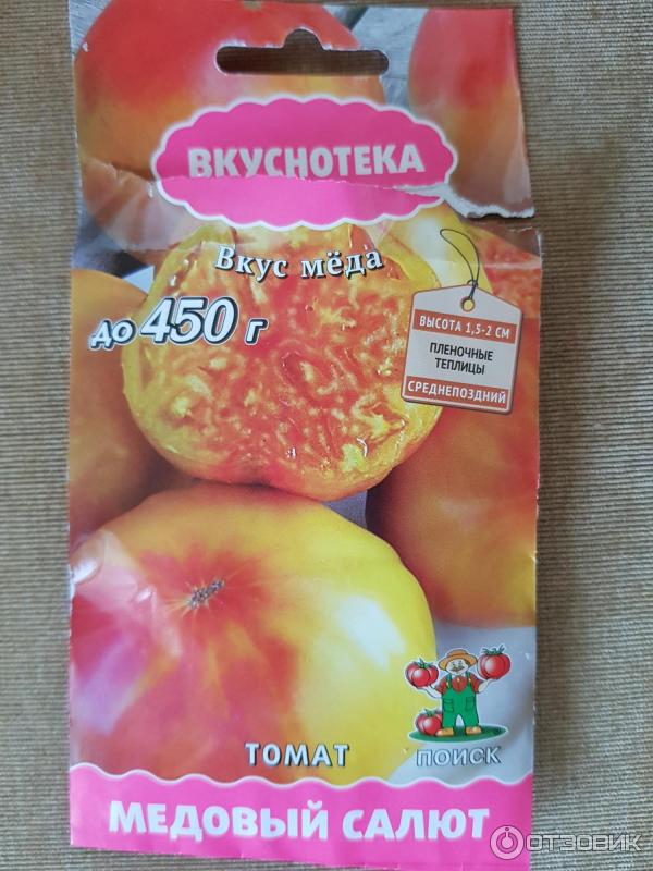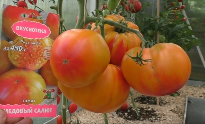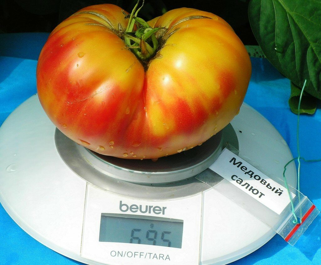 Засаждам този сорт от две години. Този красив събрат живее в нашата оранжерия. Много обичам едроплодни домати. Те не изискват никакви специални грижи. На една лоза узряват от девет до дванадесет плода. През 2020 г. най-големият плод тежеше 900 грама. През 2021 г. израсна наистина великолепен домат с тегло 1 кг 190 грама, а на лозата имаше още девет (разбира се, следващите тежаха по-малко). Ако обичате едри, месести, сладки домати, засадете Honey Salute.