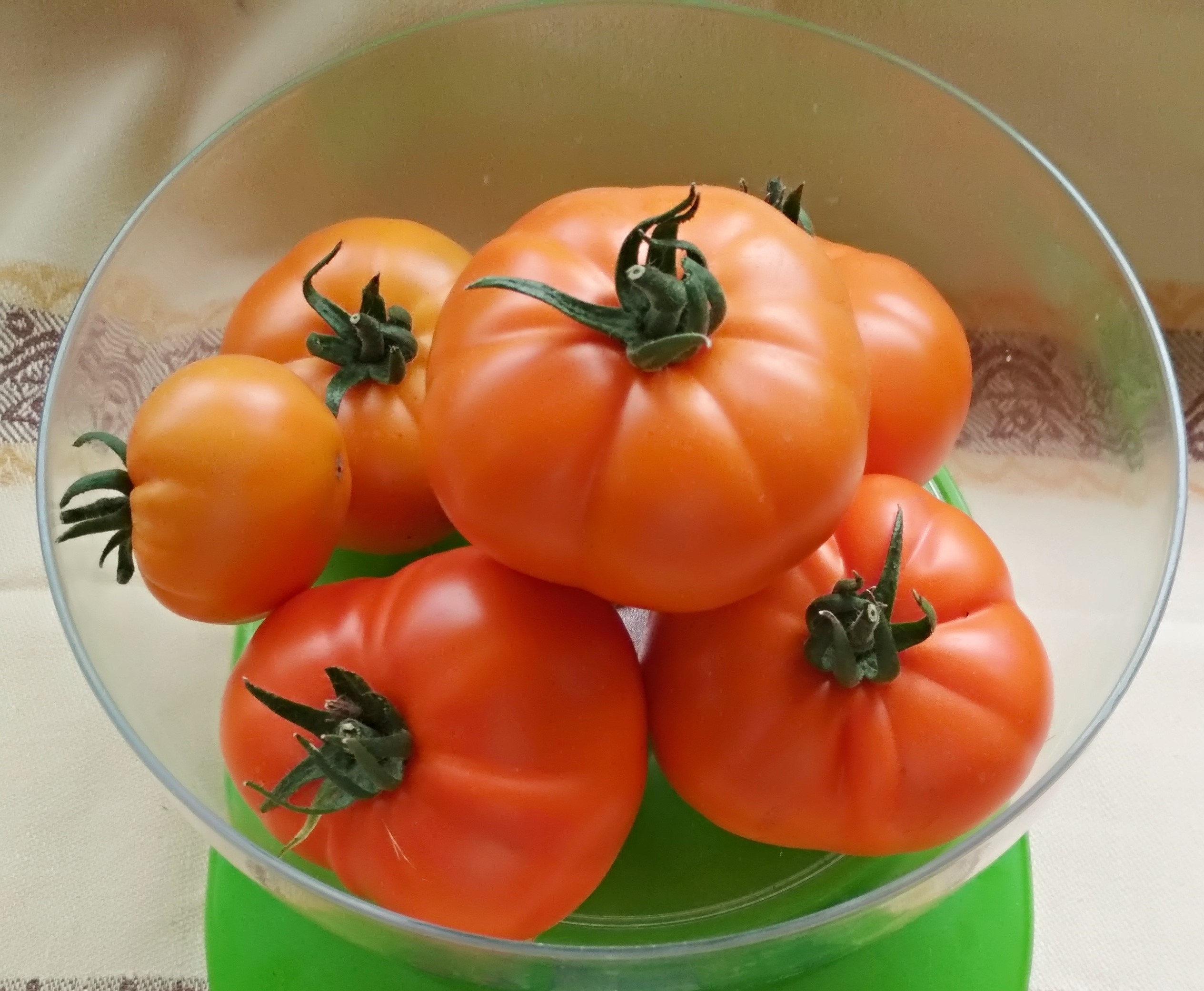 И какъв красив цвят имат тези домати! Бих го нарекла цвета на узряла райска ябълка. Доматите са с форма на сърце, а някои от по-малките много приличат на райска ябълка. Моите домати узряха много неравномерно. Първият беше на долната чепка, следващите на втората, а после и на третата, въпреки че доматите на долните чепки още не бяха узрели. Три от моите чепки се завързаха добре, но следващите имаха празнини. Завръзването на плодовете е силно зависимо от температурата в оранжерията. Когато започна жегата, спря да завръзва. Големите и средните домати тежат над 200 грама.