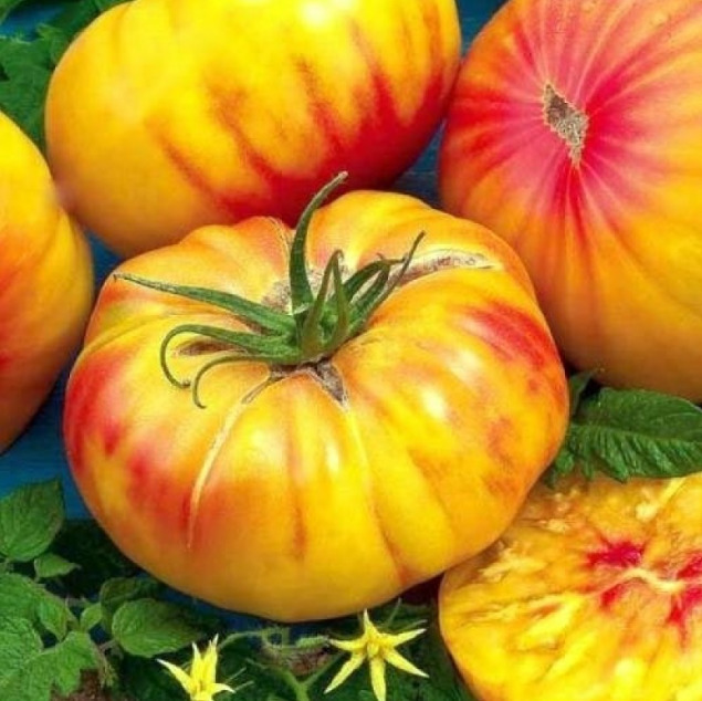 Средно ранен индетерминантен сорт за оранжерии. Подходящ за салати, предястия и преработка в доматени продукти. | Плоско-кръгли, леко оребрени, червени, 300-500 г (до 700 г). Отличен вкус. |