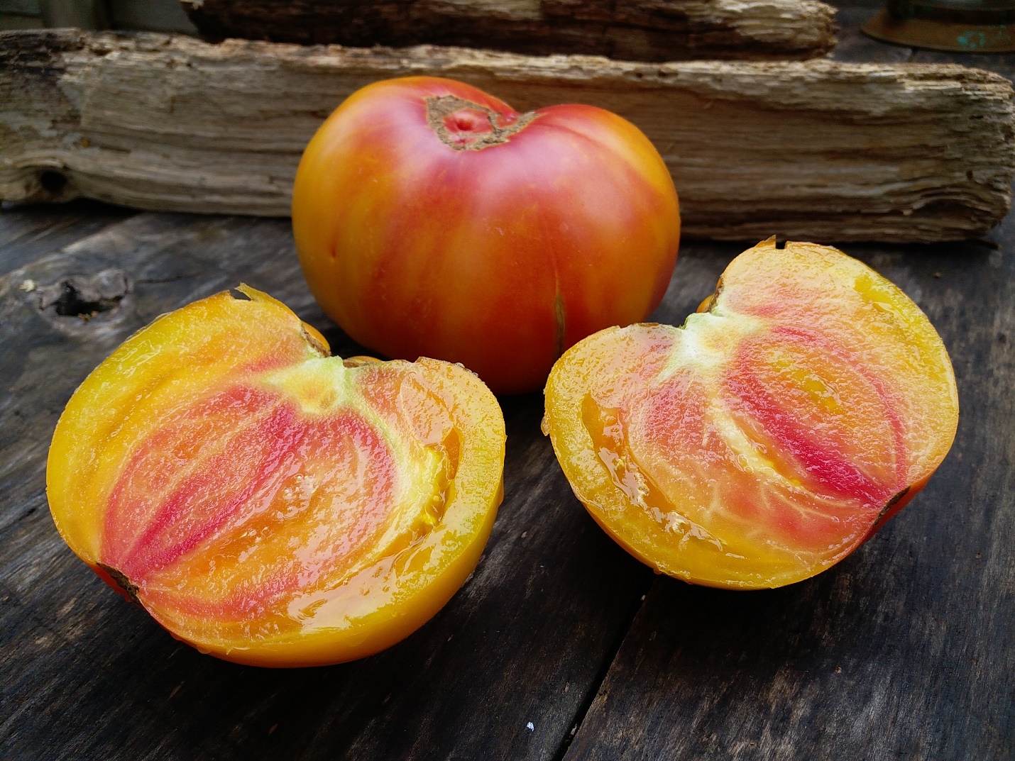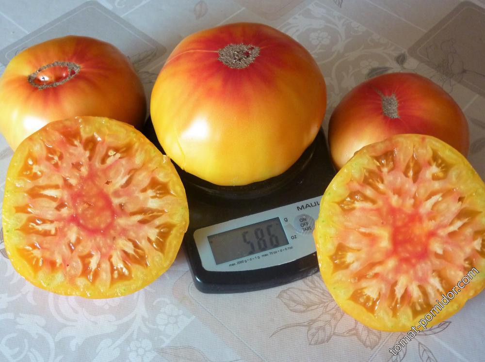 Доматът имаше две стъбла. Не образуваше гроздове. Дори на третия грозд даваше едри плодове. Много е красив напречно, с преливащи се цветове, вариращи от жълто до червено. Месест е. Семепроводите са малки. В домата има достатъчно семена, за да се запазят за засаждане в бъдещи години. Когато узрее добре, става сладък и ароматен.