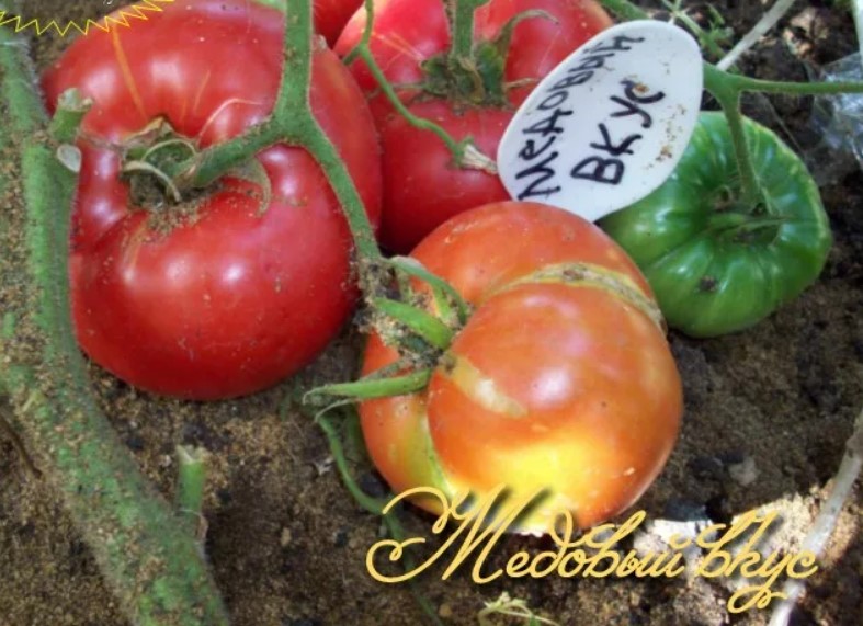 Живея в Северна Германия и от четири години се опитвам да отглеждам любимия си домат. За съжаление, всички предишни години бяха неуспешни. Тази година завърших стъклена оранжерия и в началото на март засадих разсад от различни сортове на закрито. На 15 април ги пресадих в оранжерията и създадох разсад вътре. Засадих и домати там. „Меден вкус“ беше един от най-силните. На 2 юни първите бяха малки колкото грахово зърно, а яйчниците бяха великолепни, с 10 огромни домата на първия етаж. Засадих само пет от тях, но се влюбих в този сорт. Те са без болести, листата са красиви и не се къдрят като някои други. Листата е красива и елегантна, не като другите ми слоновидни домати, като разперени репеи. Височината на „Меден вкус“ сега (4 юли 2020 г.) е приблизително 165 см, но вече премахнах точката на растеж. Надявам се да са вкусни. Благодаря на тези, които са отгледали този сорт, браво! Великолепен домат.