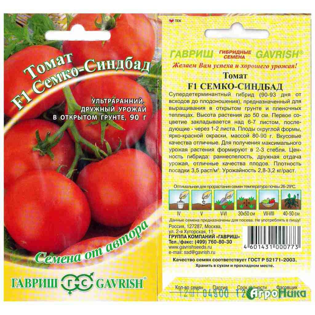 Семко Синдбад (Домат) е включен в регистъра за 3-та светлинна зона за градински парцели, домакински парцели и малки ферми. Препоръчва се за отглеждане в пролетно-лятна ротация (филмови оранжерии). Узряването на плодовете настъпва 85-93 дни след пълното поникване. Растението е детерминантно (супердетерминантно), изправено, слабо разклонено, рядко облистено, високо 50 см, с къси междувъзлия. Листът е обикновен, светлозелен, лъскав, леко гофриран. Съцветието е просто, структурата е компактна. Първото съцветие се заражда над 6-7-ия лист, следващите - след 1-2 листа. Липсват гънки по съцветието. Плодът е сплескан и заоблен, гладък, матов, цветът на неузрелия плод е зелен, с тъмно петно, узрелият е червен, основата на плода е гладка, върхът е гладък. Брой гнезда 3-4. Тегло на плода 88 г. Отличен вкус. Търговски добив 6,6 кг/кв.м, ранен добив 5,2 кг/кв.м, в сравнение с 6,6 и 4,5 кг/кв.м за стандарта Верлиока F1. Търговски добив 85%. Устойчив на вируса на тютюневата мозайка и фузариум. Стойността на хибрида: ранно узряване, постоянен добив и отличен вкус на плодовете.