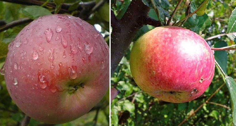 Зрелите ябълки са червени с белезникави петна по повърхността си.