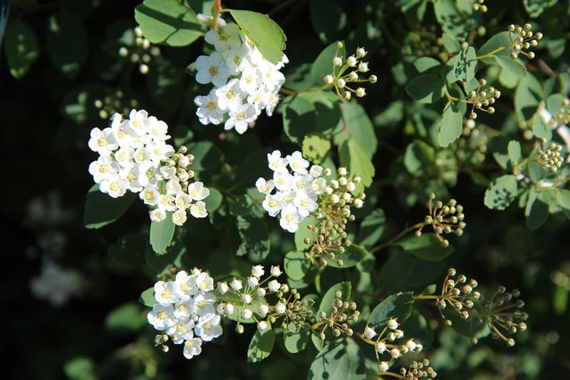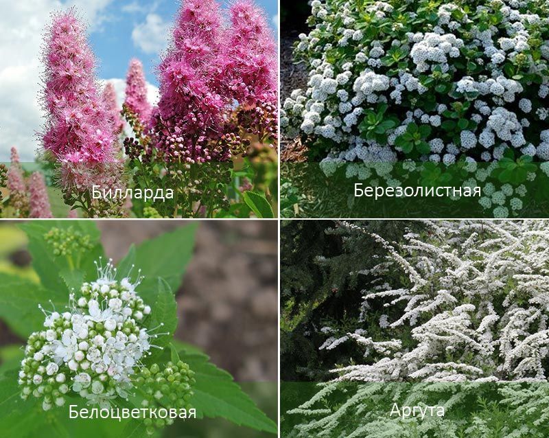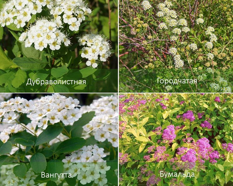 | Аргута | Разпростира се до 2 м, клоните са тънки, извити. | Тъмнозелени, тесни, назъбени, дълги до 4 см. | Снежнобяло, ароматно. |