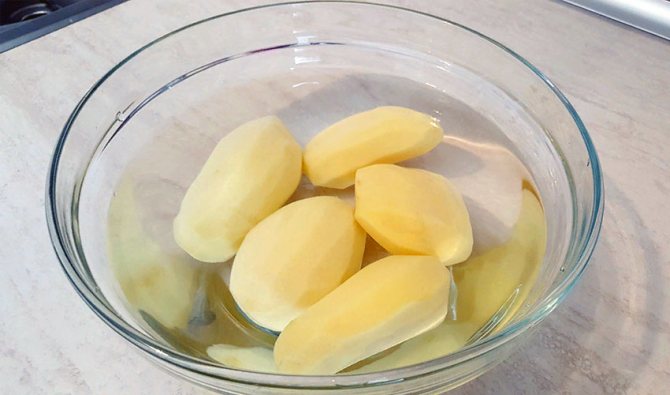 Моля, обърнете внимание! Условията за съхранение на купени от магазина, сулфатирани белени картофи са малко по-прости от тези на картофите, отглеждани в градината. Те могат да бъдат изложени на въздух, без да почернеят. Преди продажба те се обелват механично и се третират с химикали, които не са много полезни за човешкото здраве.