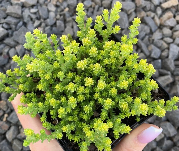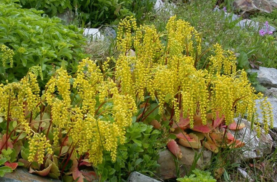 С дълги и дебели издънки, малки светложълти цветове. |