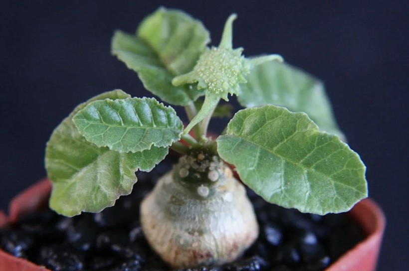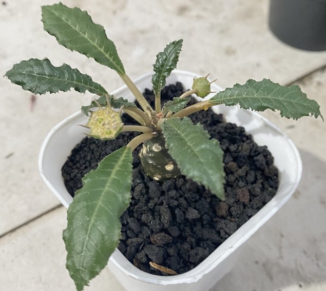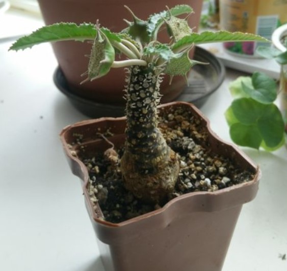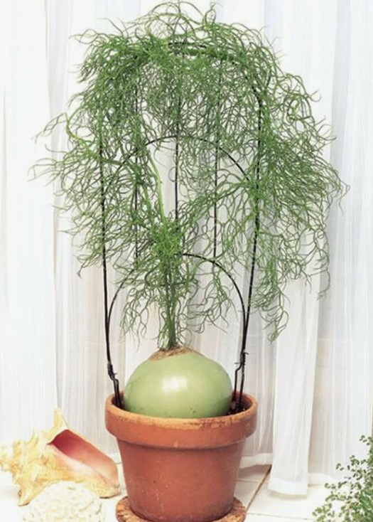 Стъблото на това растение наподобява бутилка. Листата са лопатковидни и тъмнозелени. |
