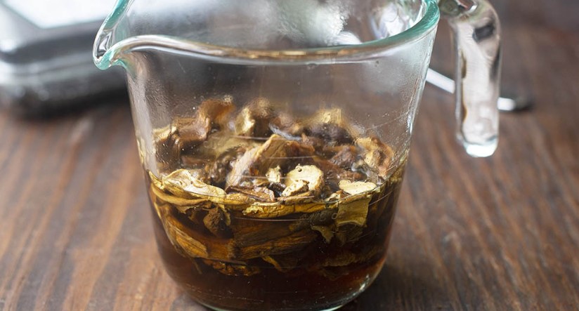 - Предварително накиснете сушените гъби във вряща вода за 30 минути.