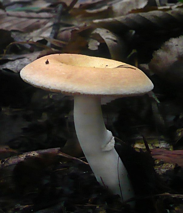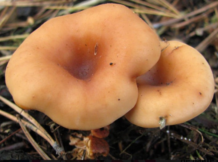 Шапката е с вдлъбнат център, жълта или охрено-оранжева на цвят. Повърхността е суха, леко напудрена, а краищата са набраздени. Гъбата расте предимно в букови гори.